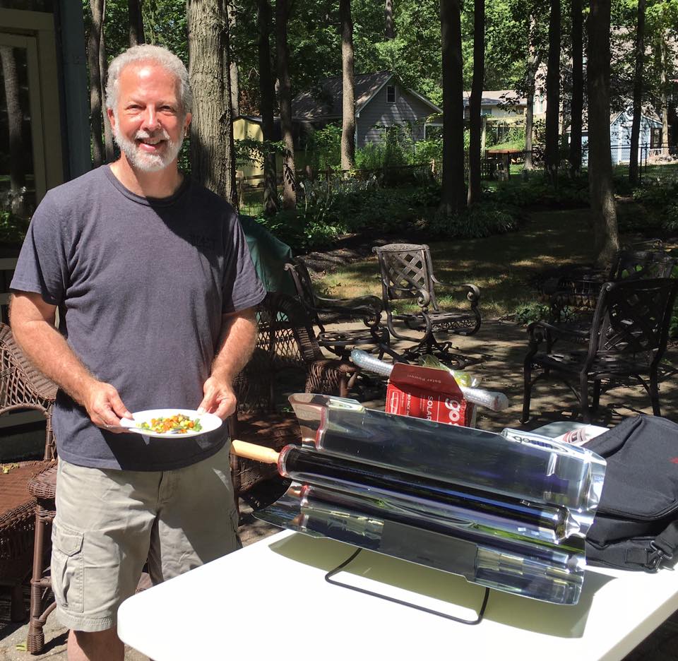John Mundell in 2019 using a solar stove in the backyard of his home in Carmel, Indiana.