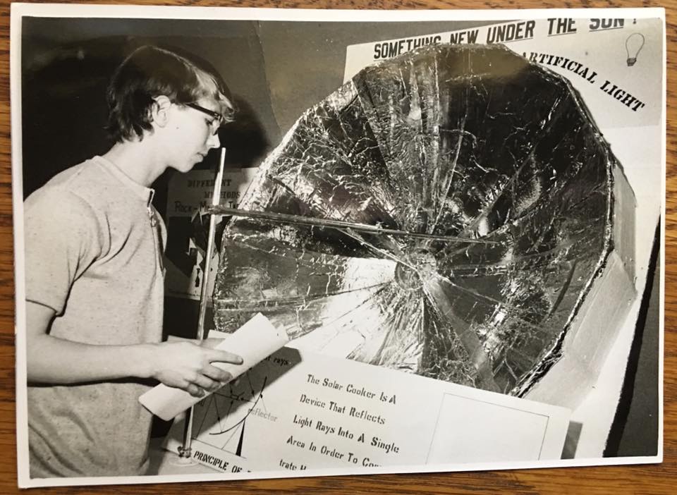 John Mundell as a freshman in high school in 1972 at the Purdue University Regional Science Fair, showing off his homemade solar cooker made out of cardboard and aluminum foil.