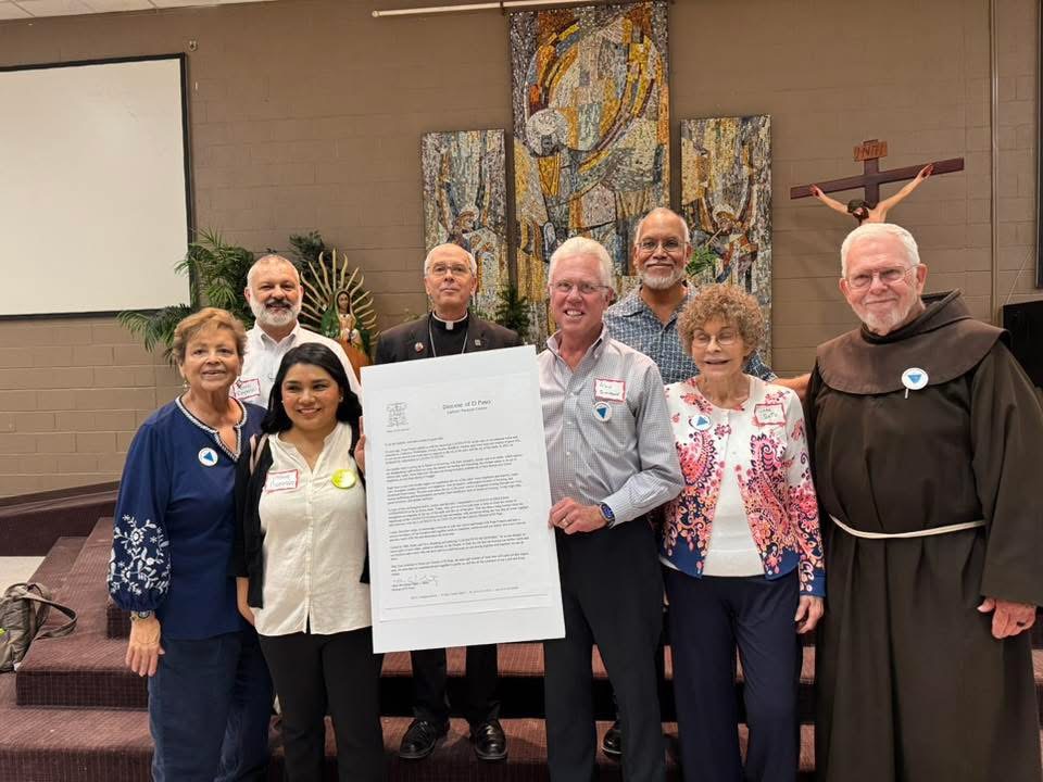 Diocese of El Paso members pictured with Bishop Seitz symbolically holding the letter of commitment signed during Laudato Si Week 2025.